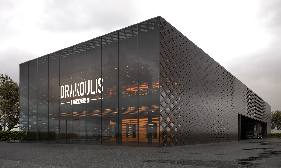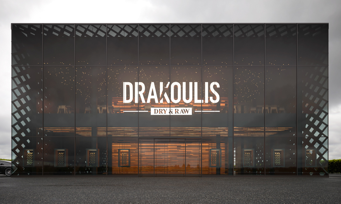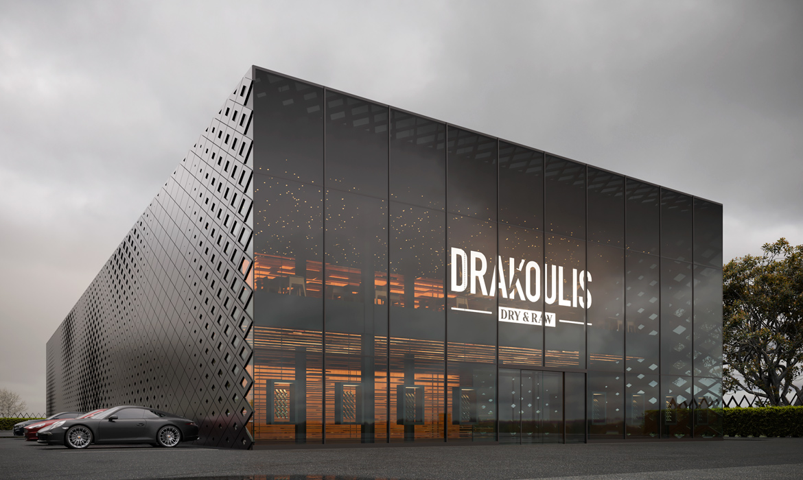 Architectural design of Drakoulis dry & Raw new building.A multi-use building that accommodates, a restaurant, a shop, a cooking training area and a meat processing area.Total area 10.500m2
